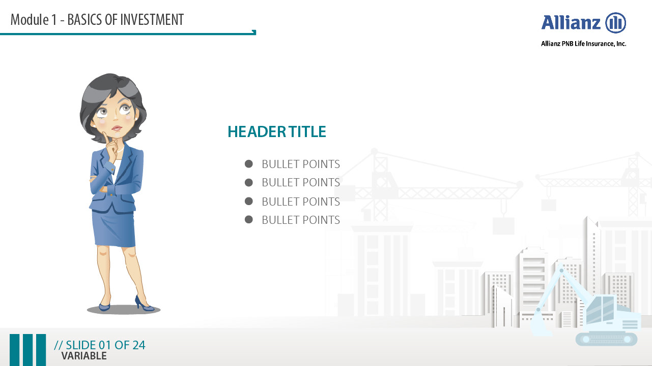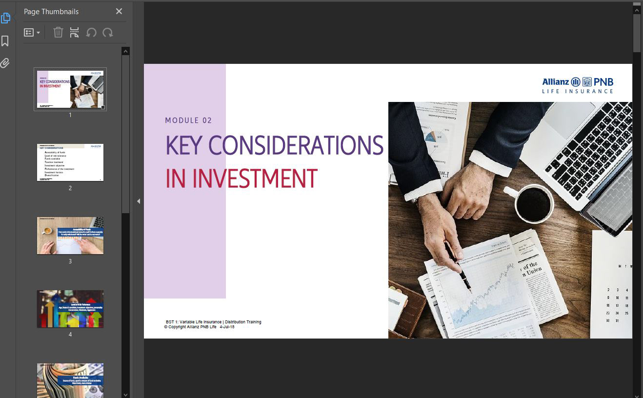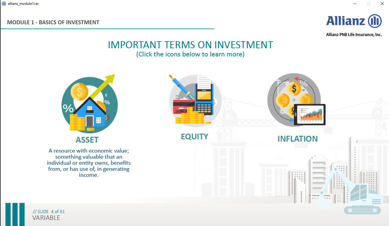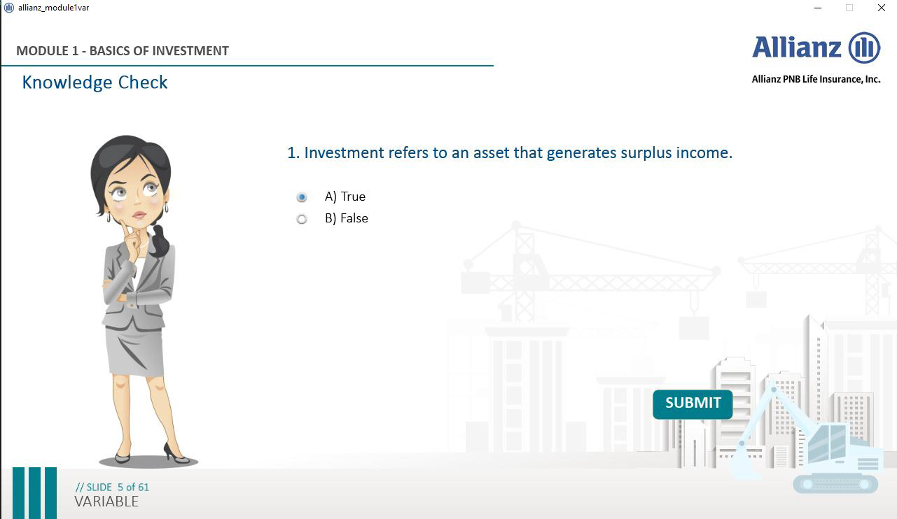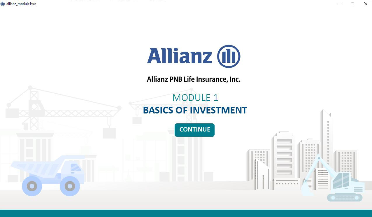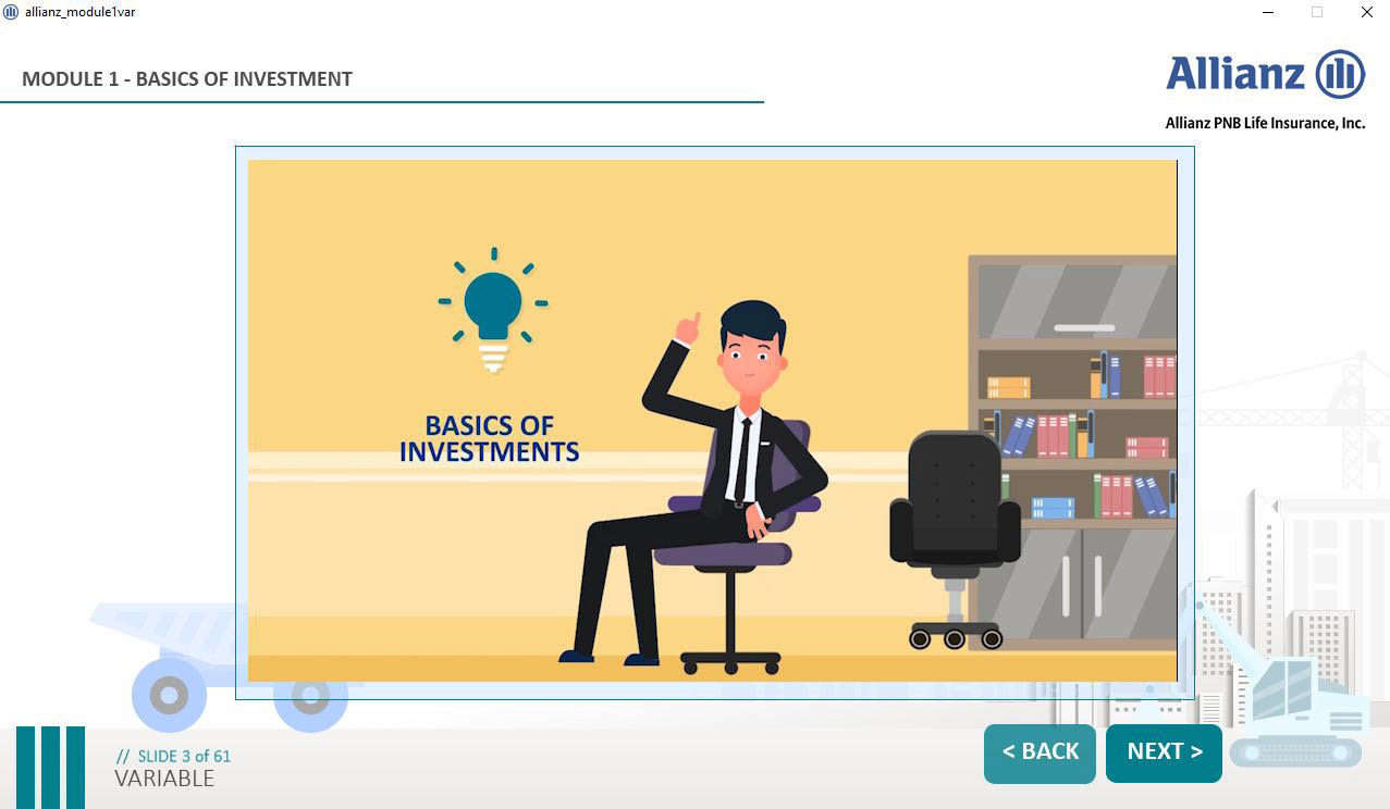 Allianz PNB partnered with Nasansistan to develop 21 eLearning modules from their training decks for both Traditional and Variable Insurance. Allianz PNB training came from a very traditional class-room based training and through this project, it ushered their transition to the Elearning platform. The purpose of the module is to prepare the Insurance agents in taking their licensure exam. The modules are all scorm compliant so they are able to use their own Learning Management System (LMS).