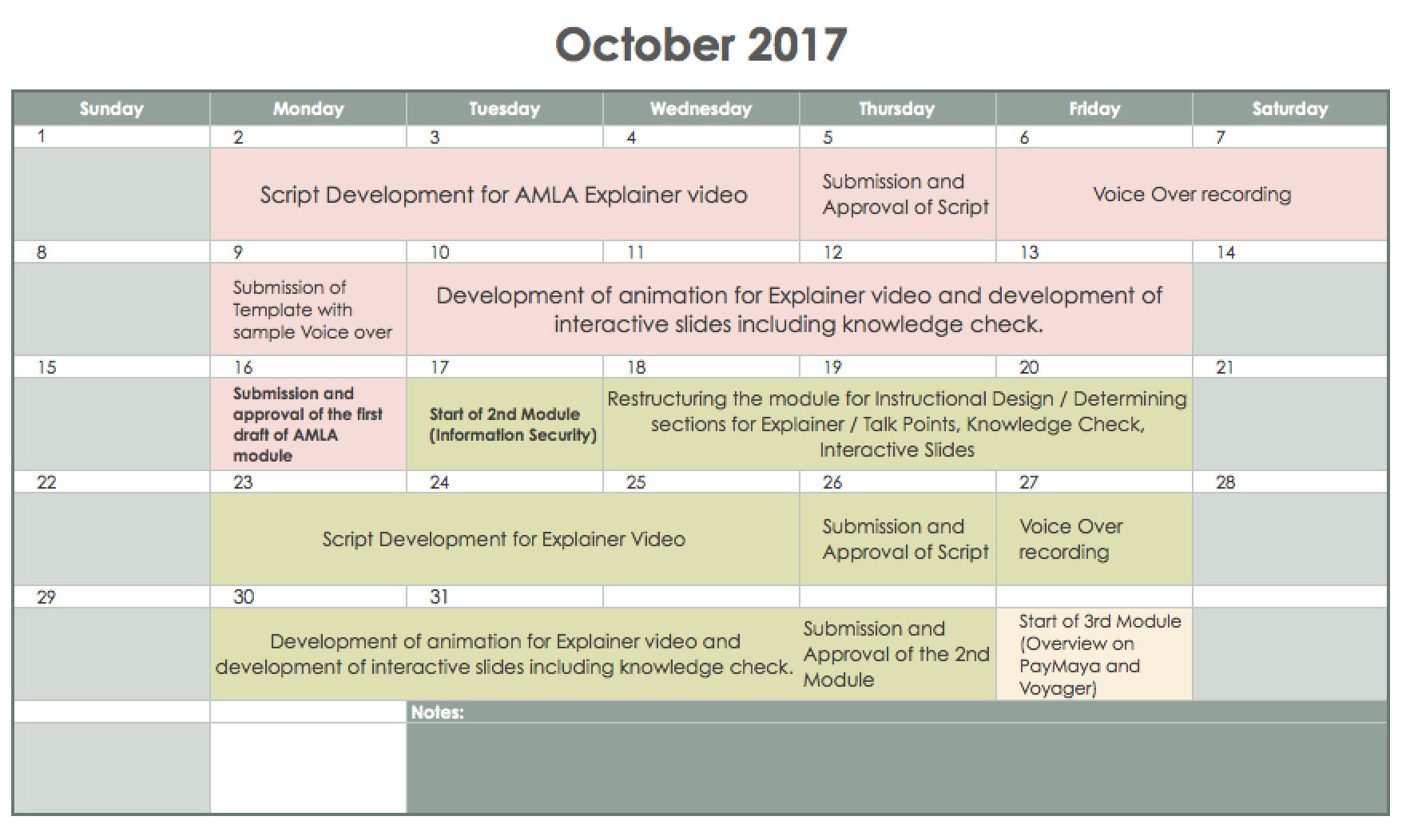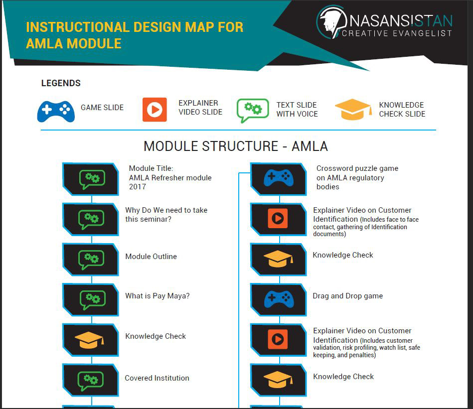 Voyager Innovations (a subsidiary of Smart Communications / Paymaya) partnered with Nasansistan Design Co to develop a series of learning modules for their on-boarding program. The process is basically converting their class-room (face to face) training into Elearning or Computer based training to maximize repetitive task. Upon approval of our proposal, we started with developing the timeline based on their requirements. From the presentation deck provided, we also developed the script and storyboard.